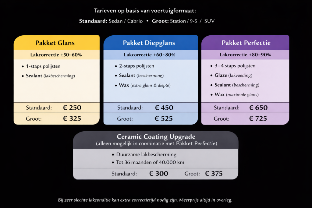 Om het kiezen eenvoudig te maken, werk ik met drie duidelijke poets- pakketten. Deze geven een heldere indicatie van prijs en resultaat. Tegelijk is geen enkele auto en geen enkele wens hetzelfde. Daarom staat persoonlijk advies bij mij altijd centraal.